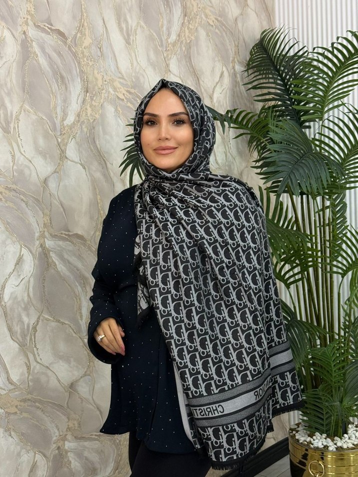 Yumuşak sentetik kumaştan, siyah ve gri tonlarında drapeli kadın şal, mütevazı sokak stili için uygundur.