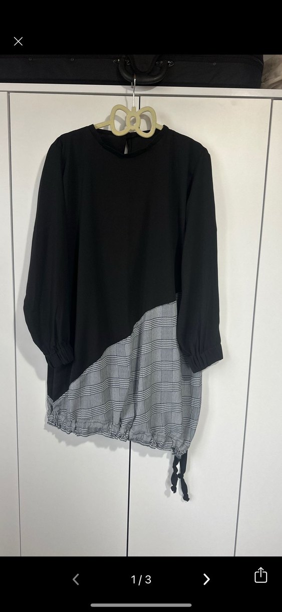 Uzun kollu, yuvarlak yakalı, siyah ve gri kareli keten kumaşın drapeli tasarımıyla dikkat çeken bol kesim tunik. 40-42 bedene uyumlu