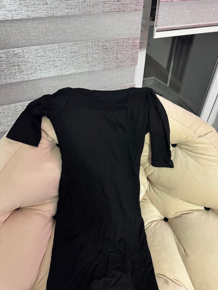 Drapeli siyah hamile elbisesi, tekne yaka ve kısa kollu, ince sentetik kumaştan. Midi boyda ve günlük sokak giyimine uygun.