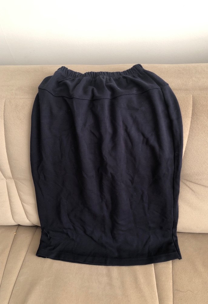 Siyah renkli, drapeli ve midi boyda, vücuda oturan hamile eteği. Yumuşak ve sıcak dokusuyla günlük kullanım için uygundur.
