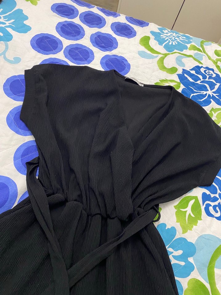 Uzun siyah tulum V yaka ve kolsuz tasarımla bol kesim sunar. Yumuşak sentetik kumaştan drapeli ve minimalist sokak stili için uygundur. İdeal bir üründür hafif tiftiklenmesi vardır