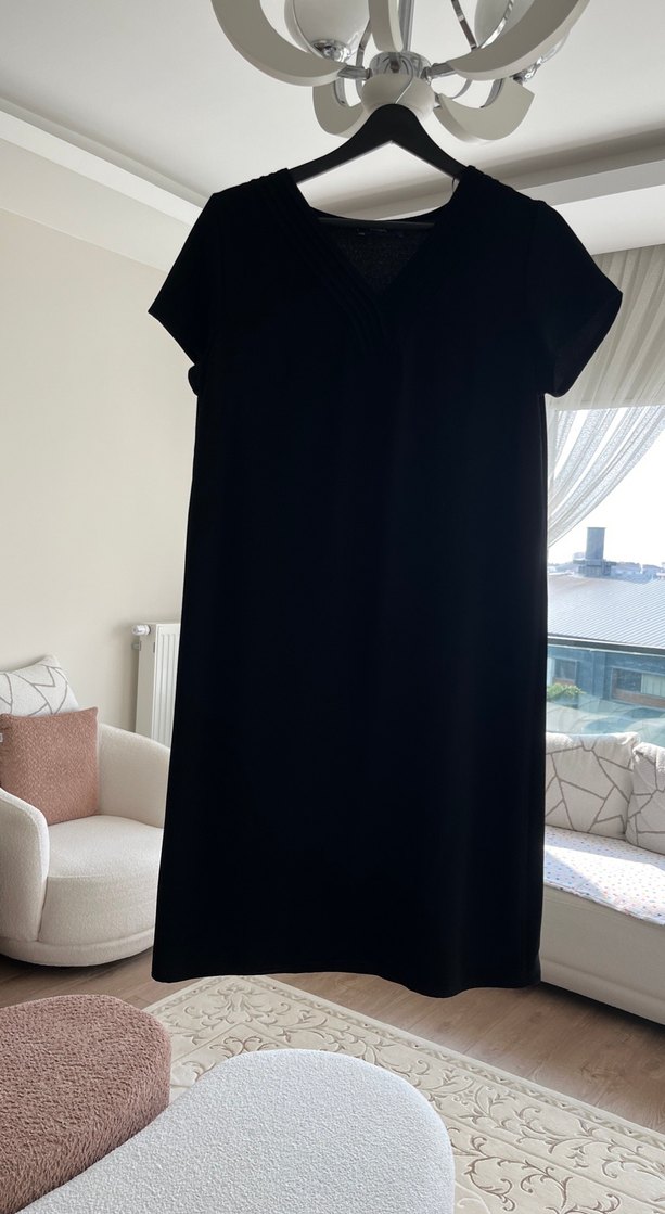 Drapeli, V yaka, kısa kollu siyah hamile tunik. Rahat kesimi ve midi boyu ile günlük kullanıma uygundur.