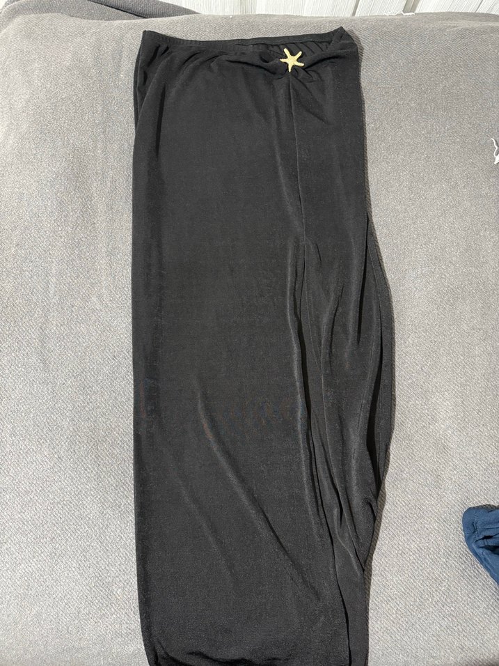 Siyah, drapeli ve uzun kesim hamile eteği, yumuşak sentetik kumaştan, rahat günlük kullanım için uygundur.