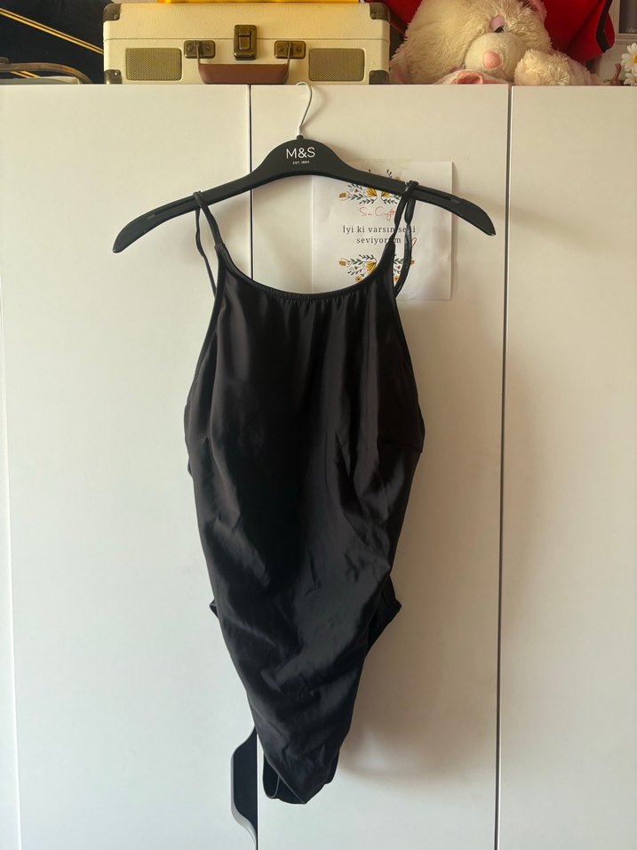 Drapeli tasarıma sahip, ip askılı siyah kadın mayo, midi boyda ve günlük kullanıma uygun. Streetwear ve athleisure tarzını yansıtan şık bir model.