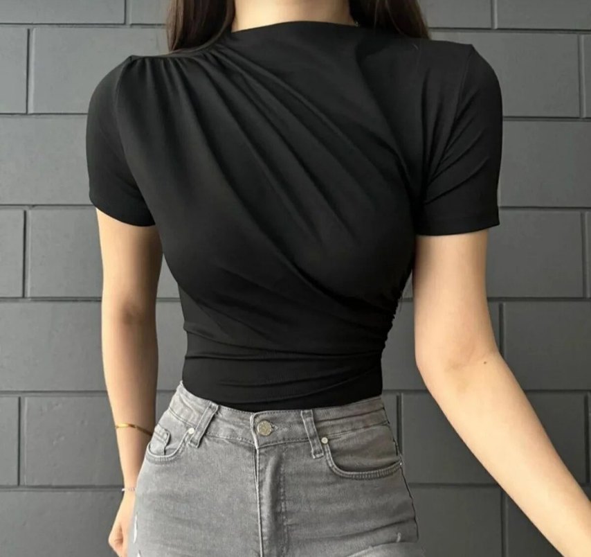 Drapeli tasarıma sahip, yuvarlak yakalı ve kısa kollu siyah, vücuda oturan kadın bluzu. Yumuşak sentetik kumaştan, günlük kullanım için uygundur. 1 defa giyildi sorunsuzdur tertemizdir 38 42 bedene kadar uyumludur