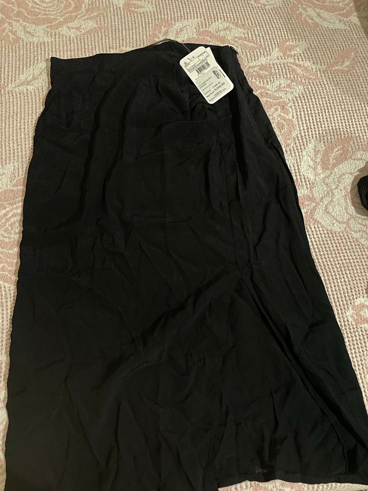 Siyah, drapeli ve bol kesim etek, ipeksi kumaştan, sokak stili ve günlük kullanım için uygundur.