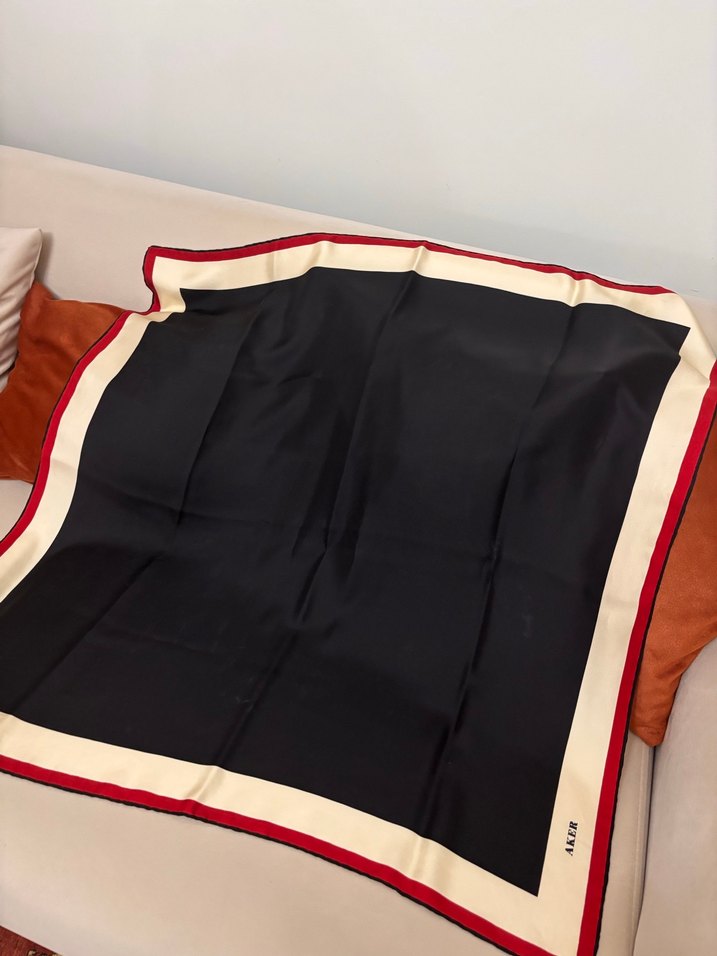 Kadınlar için drapeli, siyah sentetik kumaştan yapılmış, krem ve kırmızı kenarlıklı tvil ipek yıkamadan dolayı ufak beyazlıkları var