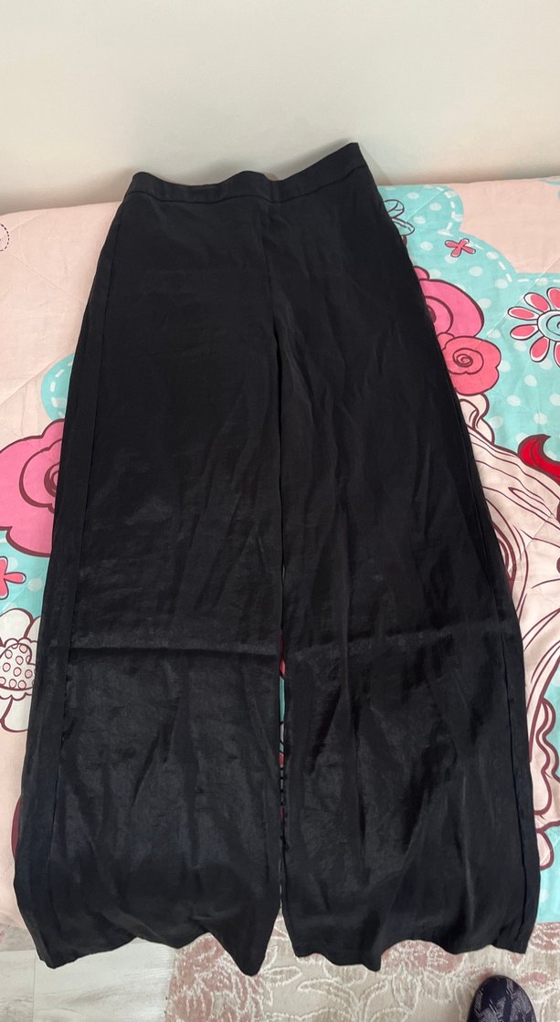 Drapeli tasarıma sahip, midi boy, siyah, kadın kumaş pantolon. Yumuşak sentetik kumaştan üretilmiştir ve günlük kullanıma uygundur.