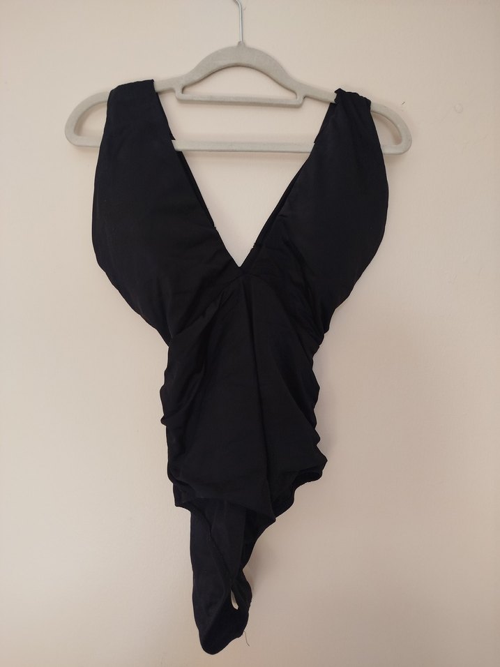 Drapeli ve askılı detaylı, vücuda oturan siyah kadın mayo, ekstra ince gösteriyor hiç giymedim kışın almıştım,farklı model alınca bu kaldı