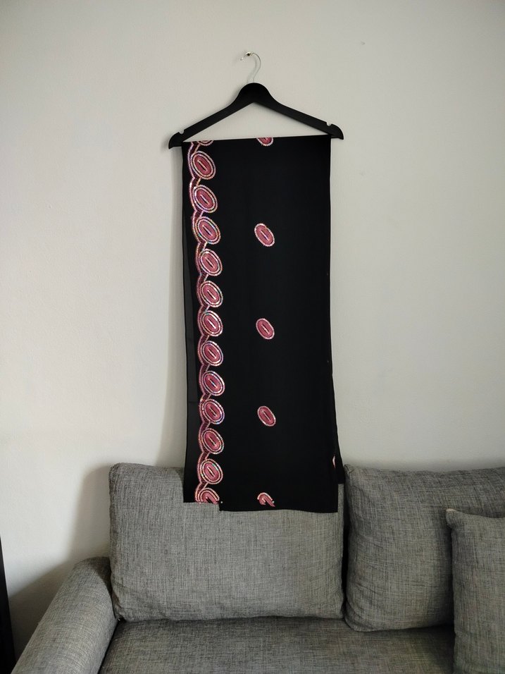 Kadınlar için drapeli, siyah renkli tekstil şal. Minimalist ve çağdaş tarzda, retro desen detaylarıyla bohem ve hippie görünüme uygundur.