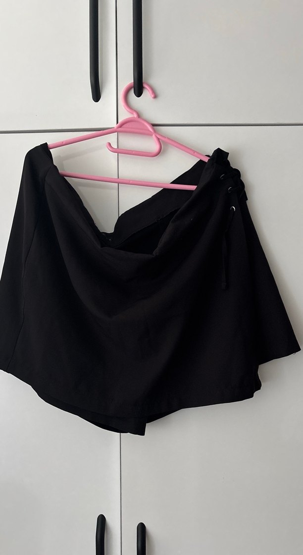 Siyah renkte, drapeli ve bol kesimli, ipeksi dokusuyla gotik tarzda mini şort kadın eteği.
