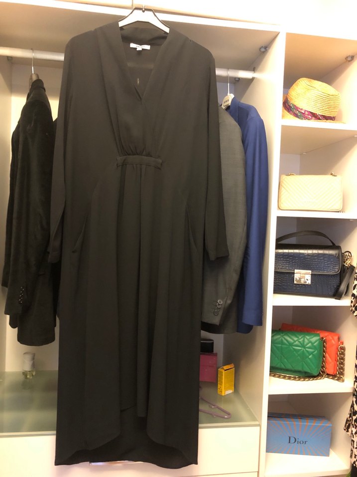 Drapeli detaylara sahip, siyah renkte uzun ve bol kesim kadın elbisesidir. V yaka ve uzun kolludur, yumuşak sentetik kumaştan üretilmiştir. Dior markalıdır.