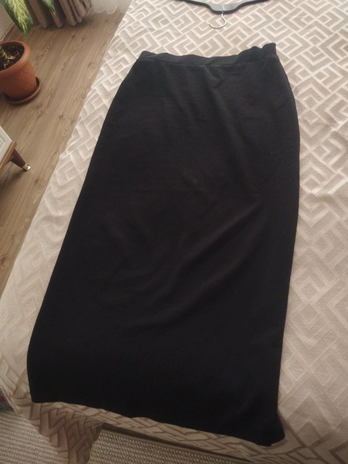 Drapeli ve siyah renkte, sentetik kumaştan yapılmış, uzun ve vücuda oturan kadın eteği. Minimalist gotik tarzı için uygun, sade ve günlük kullanıma uygun.
