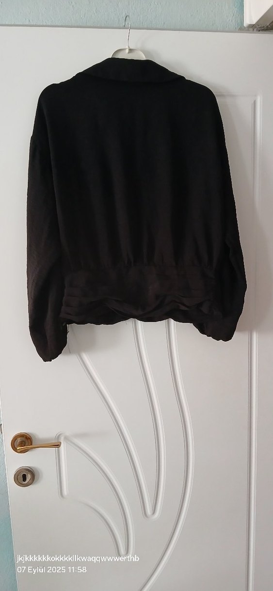 Siyah keten gomlek, drapeli tasarım, yuvarlak yaka ve uzun kolludur. Salaş kesim ve midi boydadır, günlük kullanıma uygundur.