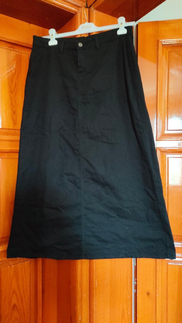 Drapeli tasarıma sahip siyah keten uzun etek, ofis kullanımı için uygun, sade ve minimalist tarzda.38 -42 ile uyumlu
