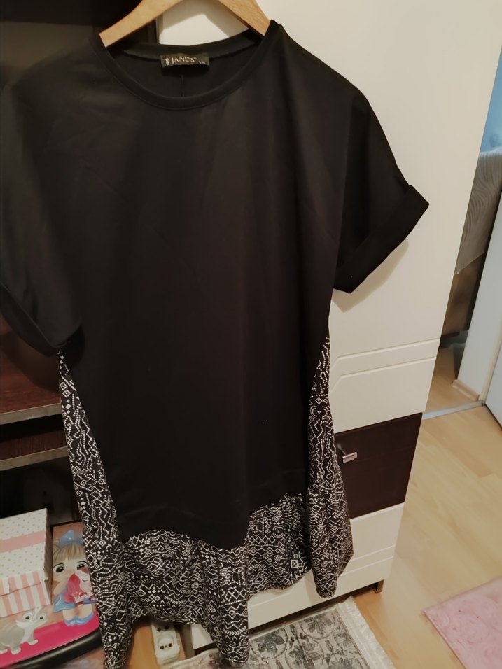 Siyah kısa kollu, drapeli baskılı mini etek ucu ve yuvarlak yakalı, rahat kesimli sentetik kumaştan günlük kullanıma uygun bluz.