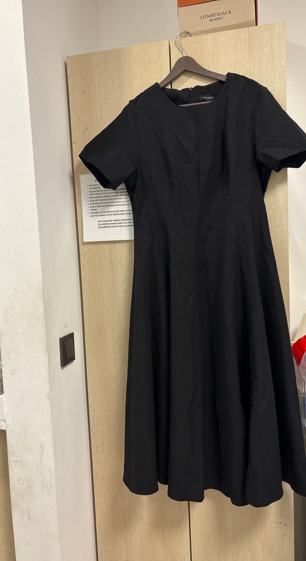 Siyah uzun elbise, kısa kollu ve yuvarlak yaka, drapeli detay ve normal kesimle ofis kullanımı için uygun. Midi boy büyük beden