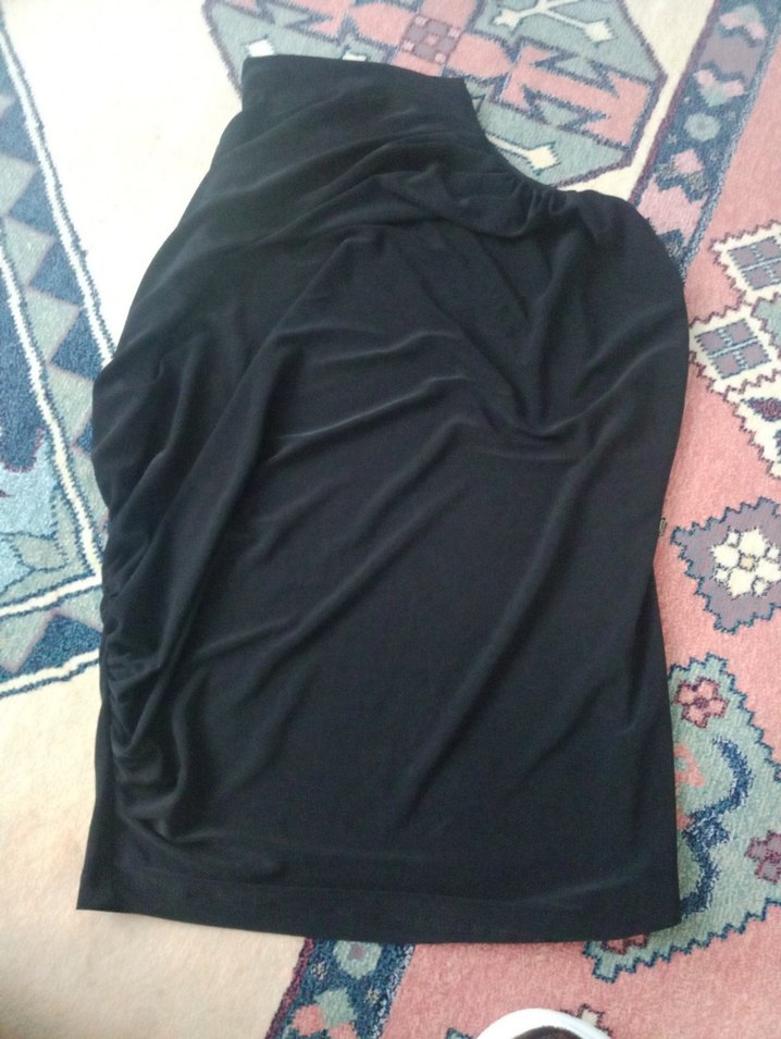 Drapeli, kolsuz, balıkçı yaka ve midi uzunlukta siyah bluzu. İpeksi kumaştan yapılmış, günlük rahat kullanıma uygun goth tarzında.