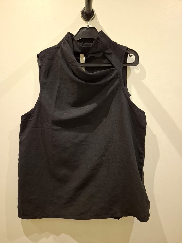 Yumuşak keten kumaştan, yüksek yakalı ve drapeli tasarıma sahip siyah kolsuz bluz. Rahat kesimi ve midi uzunluğu ile günlük kullanıma uygun.Göğüs kısmı küçük geldiği için hiç giyilmedi.