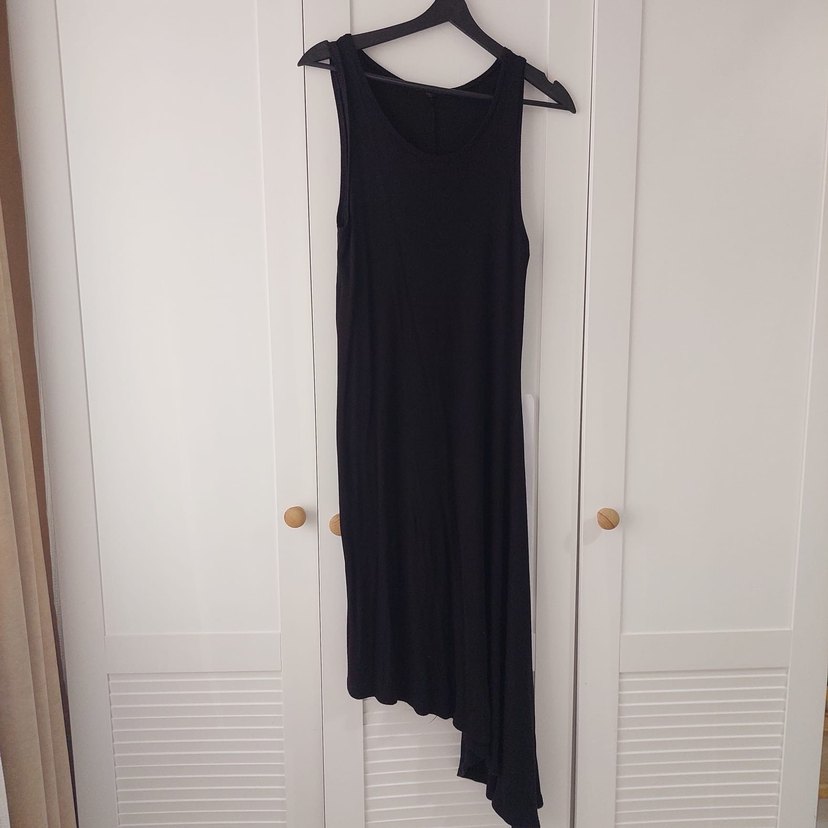 Siyah keten kumaştan, kolsuz, drapeli ve bol kesim V yaka uzun elbise, minimalist gotik tarzda günlük kullanım için uygundur.