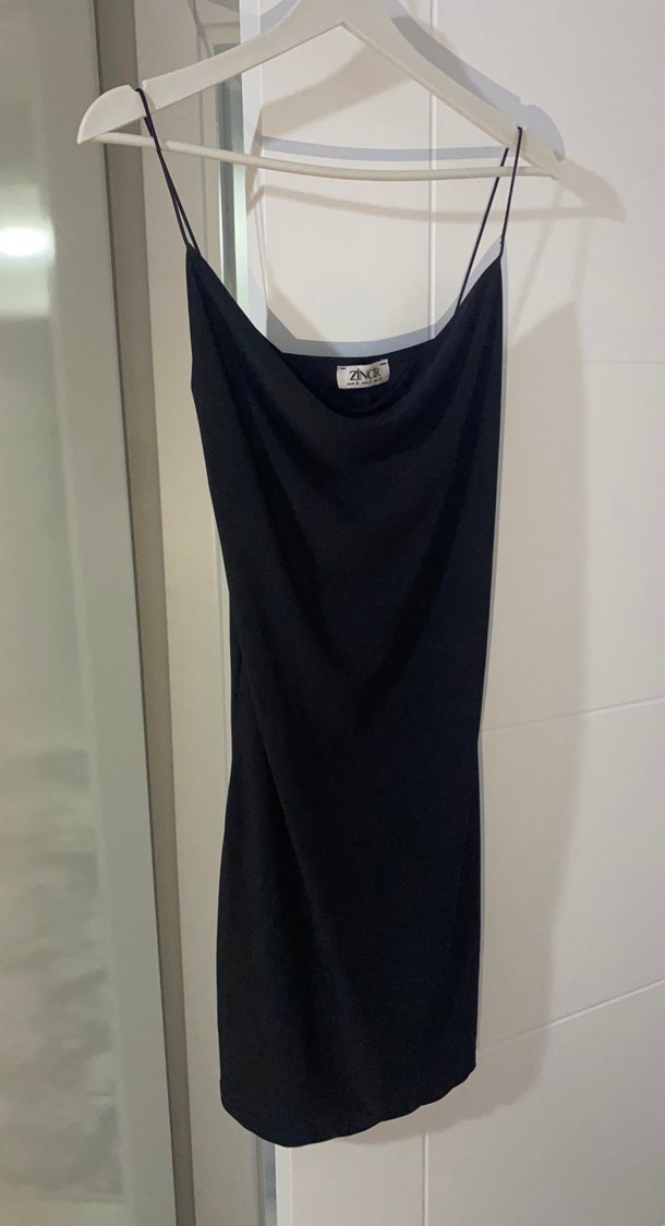 Drapeli kayık yaka, kol kısmı kolsuz, vücuda oturan siyah midi elbise. Romantik akşamlar için şık ve minimal bir tercih.