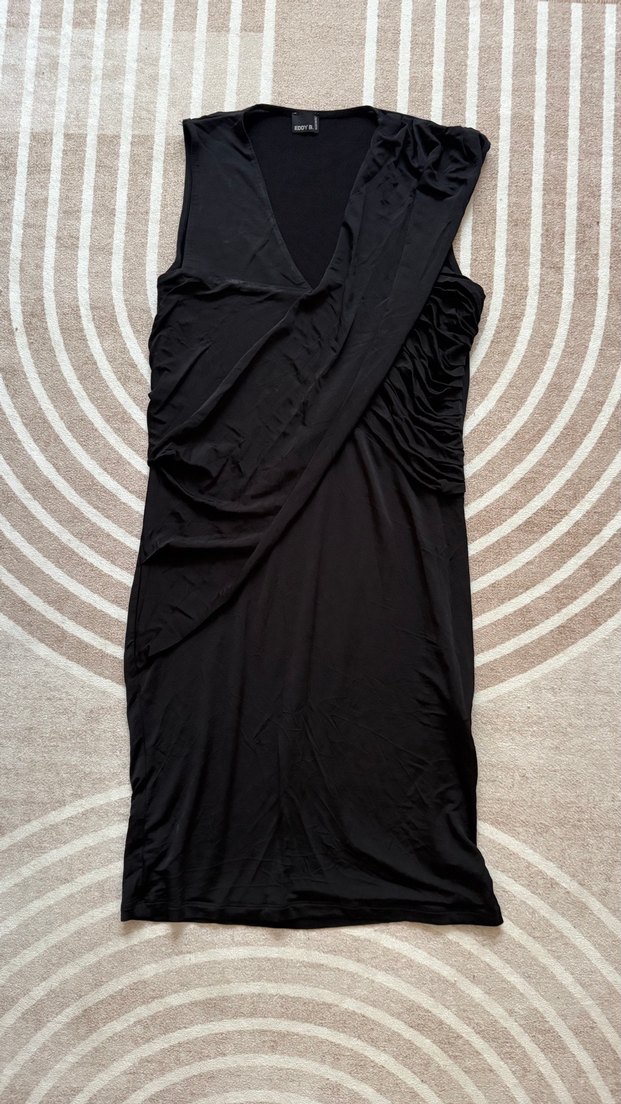 Yumuşak keten kumaştan, drapeli ve V yaka, kolsuz siyah midi elbise. Günlük kullanım için uygun, vücuda oturan kesimde.