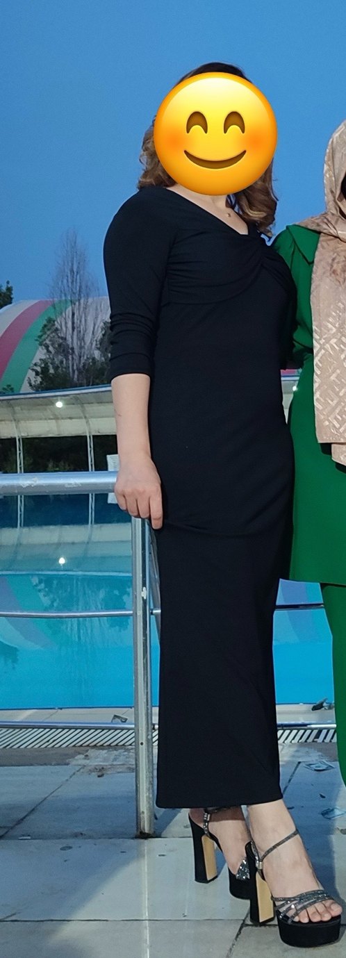 Drapeli detaylara sahip, yüksek yakalı ve uzun kollu siyah midi elbise, pürüzsüz sentetik kumaştan üretilmiştir, ofis için uygundur.