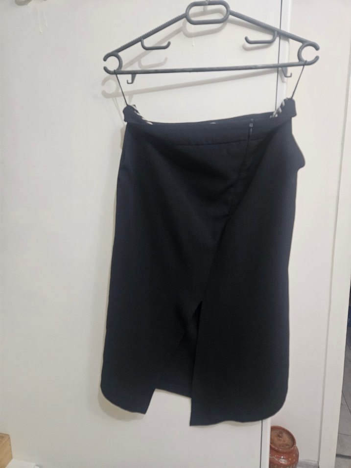 Drapeli siyah midi etek, sentetik kumaştan, ofis ve sokak modasına uygun sade ve şık tasarıma sahip.