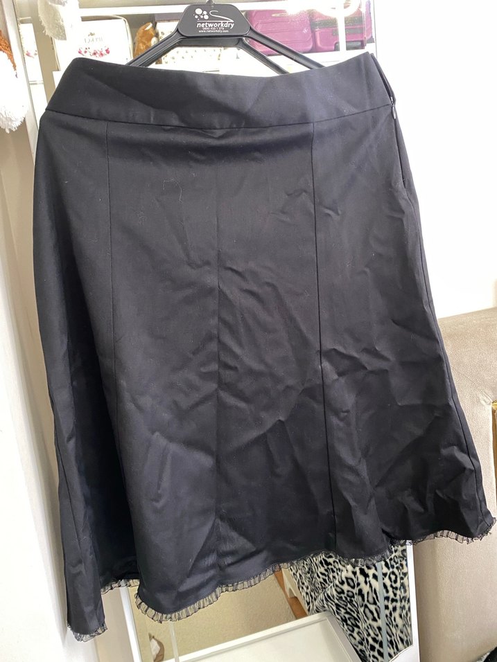 Drapeli detaylara sahip, siyah midi boy eteği, rahat kesim ve sentetik kumaştan üretilmiştir. Ofis için goth tarzıyla dikkat çeker.