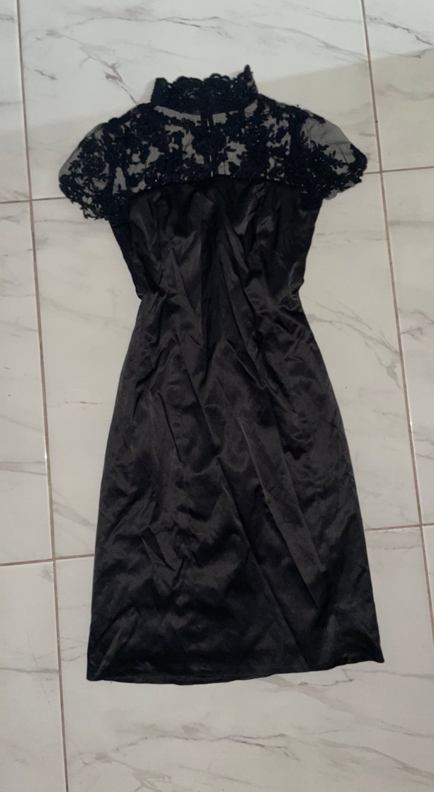 Drapeli ve dantelli üst kısmı olan, yüksek yakalı, kolsuz, siyah midi boy abiye elbise. Gotik tarzda, şık ve klasik bir seçim.