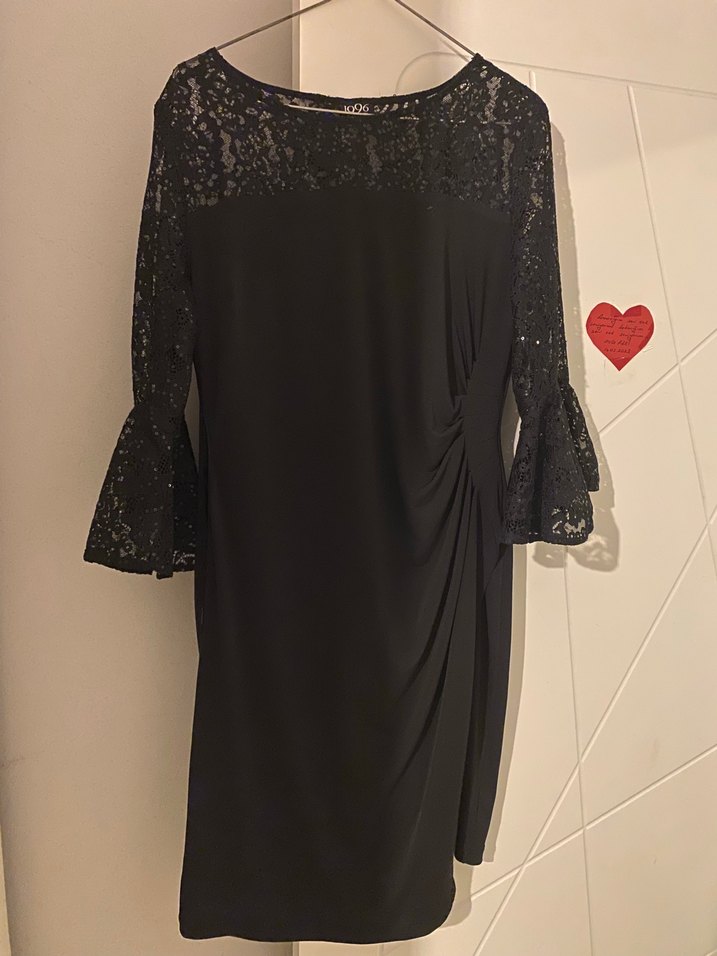 Uzun dantel kollu, V yakalı, drapeli siyah midi elbise. Gotik stil ile klasik zarafeti birleştirir, ofis için uygundur.