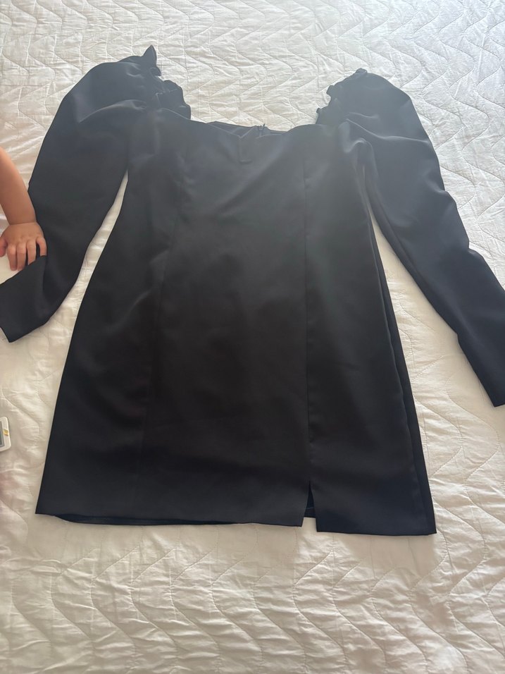 Dar kesim siyah midi elbise, uzun kollu, V yaka ve drapeli detaylara sahiptir. Cesur, minimalist gotik tarz için uygundur.