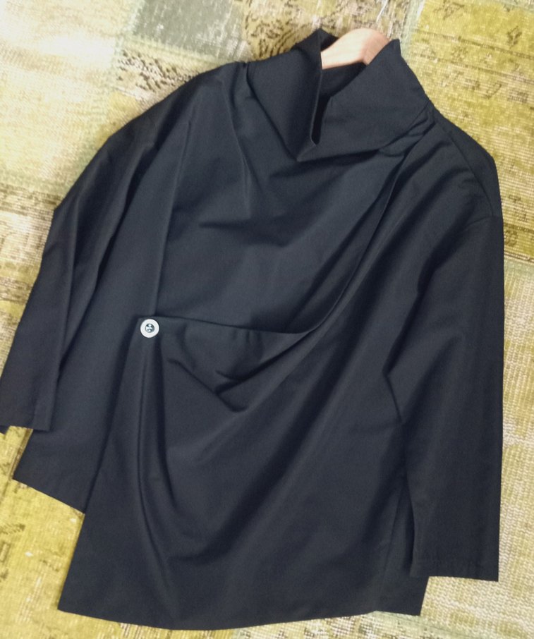 Siyah midi drapeli tasarımı, yüksek yaka ve uzun kollu. Gevşek kesim, düğme detayı ile sentetik kumaştan günlük kullanıma uygun.