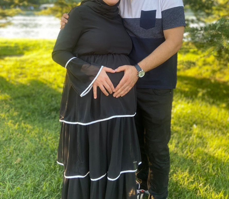 Drapeli katmanlara sahip, beyaz şerit detaylı, siyah ve sentetik kumaştan yapılmış, modest gotik düğünler için uygun, vücuda oturan midi hamile eteği.