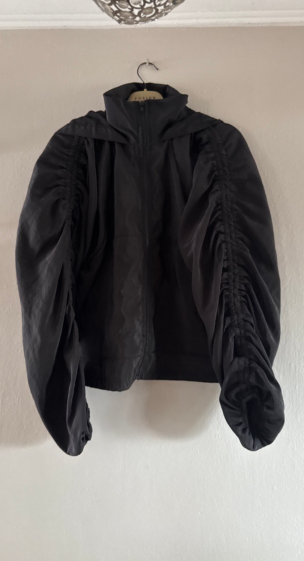 Yüksek yakalı, drapeli uzun kollu, siyah kadın ceket. Gevşek kesimi ve midi boyu ile gotik tarzda günlük kullanıma uygun.