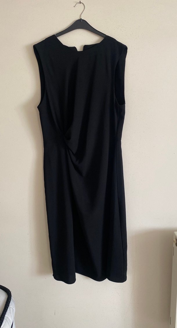 Siyah, kolsuz midi elbise, v yaka ve drapeli tasarımıyla şık ve modern bir görünüme sahiptir.