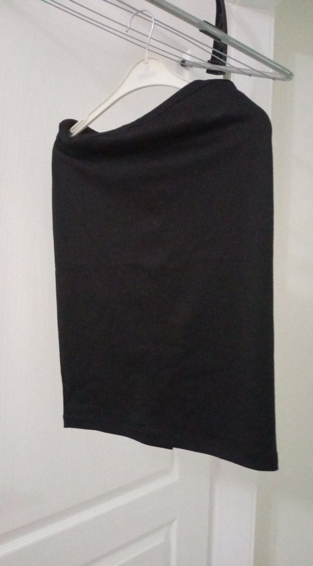 Drapeli, siyah midi boy, sentetik kumaştan yapılmış, vücuda oturan kadın eteği. Sokak stili ve günlük kullanım için uygundur.