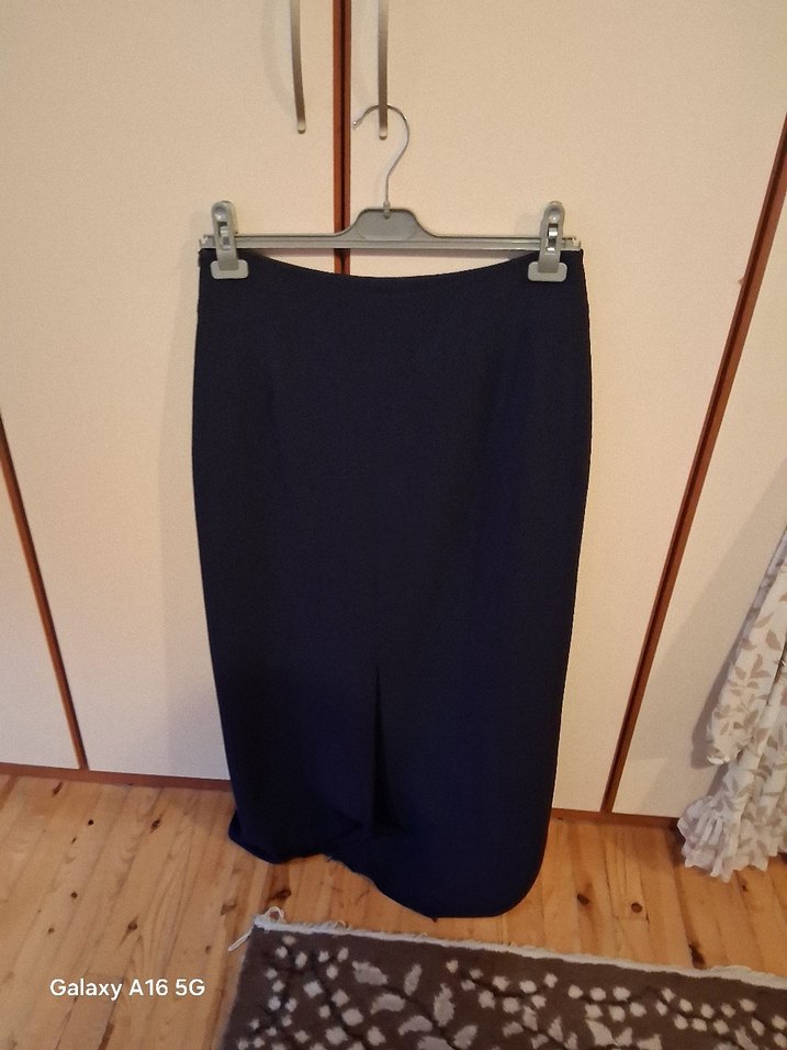 Drapeli detaylara sahip, siyah midi kalem etek, ofis kullanımı için uygun, düz sentetik kumaştan üretilmiştir.