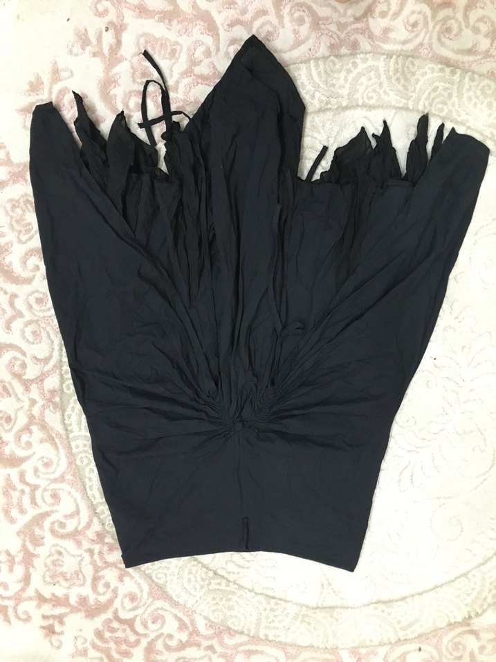 Yumuşak pamuk kumaştan yapılmış, drapeli ve asimetrik tasarıma sahip, siyah midi uzunlukta ve vücuda oturan gothic tarzda etek.