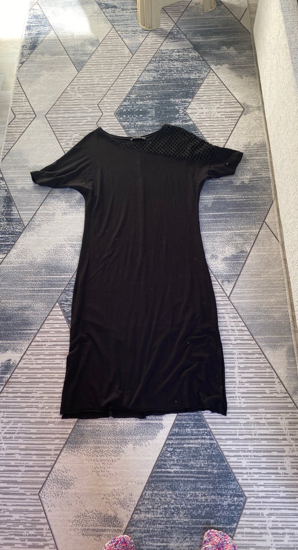 Drapeli detaylı, kısa kollu, tek renk siyah midi elbise, tekne yaka ve vücuda oturan kesime sahip.