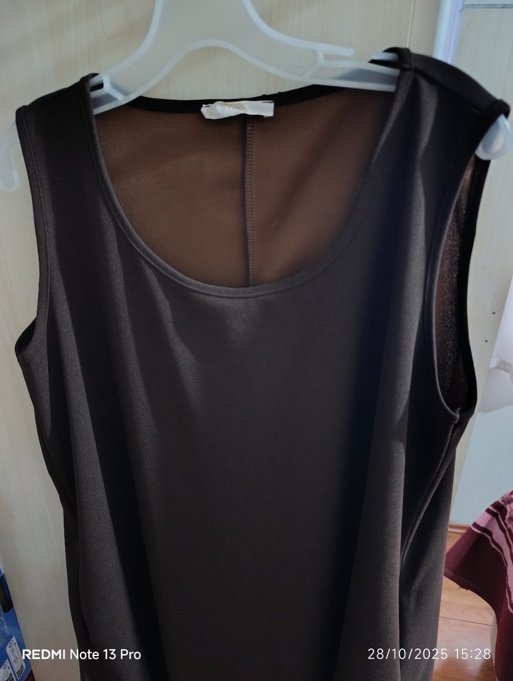 Kahverengi, kolsuz ve drapeli detaylı, ince sentetik kumaştan yapılmış, normal boy midi günlük elbise.