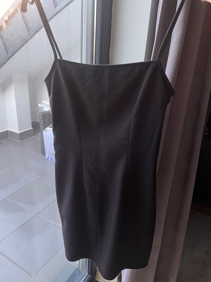 Siyah, straplez ve drapeli tasarıma sahip, vücuda oturan midi elbise. Minimalist gotik stil sunar, günlük kullanım için uygundur.