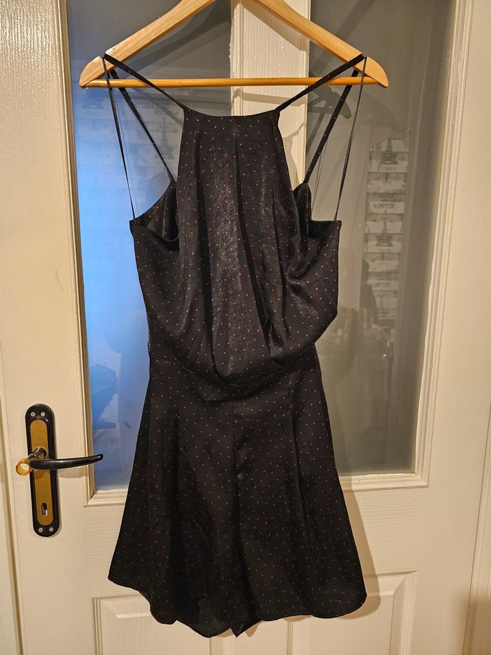 İADE YOKTUR! Zara, M beden, siyah üzerine kırmızı puantiyeli, parlak kumaşlı, sırtı açık kurdele detaylı, şortlu, askılı tulum. Hiçbir kusuru yoktur özel bir günde topuklu veya babetle tercih edilebilir. Oldukça şık bir parçadır.