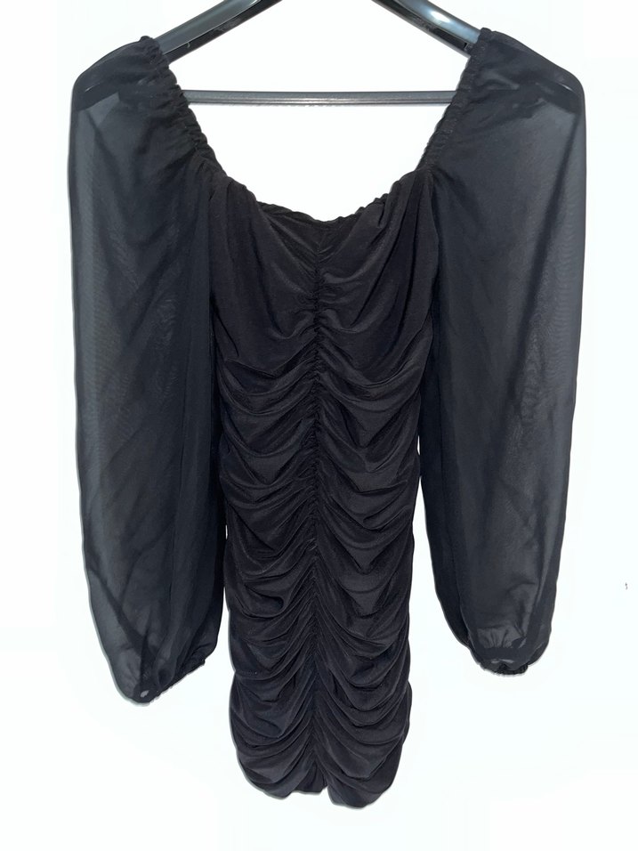 Drapeli, siyah mini boy abiye elbise, tekne yaka ve uzun balon kolludur romantik akşamlar için uygundur.