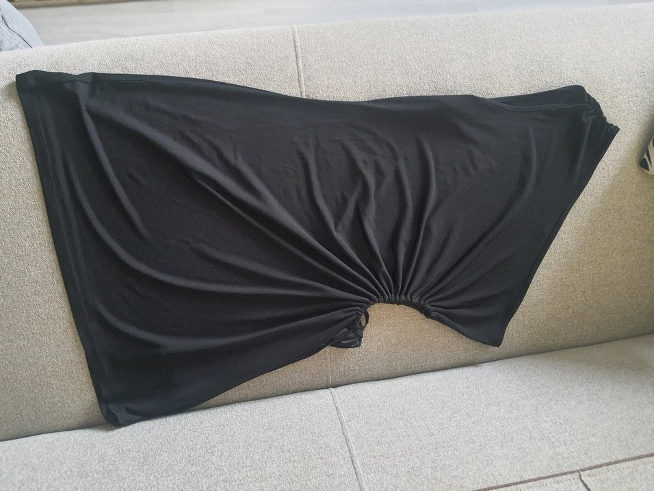Yumuşak sentetik kumaştan, drapeli ve uzun kesim siyah elbise. Minimalist gotik tarzıyla dış mekan kullanımı için uygundur.