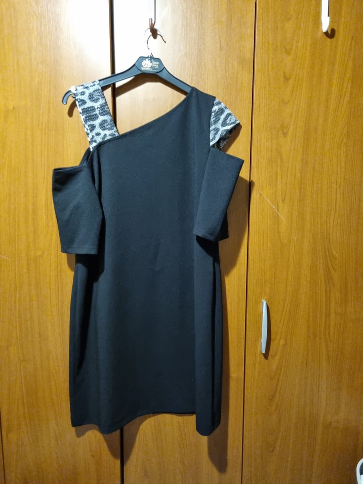 Siyah mini elbise, drapeli ve askılı kollu, bol kesimdir. Asimetrik yakası ve gri baskılı detaylarıyla gecenize şıklık katar