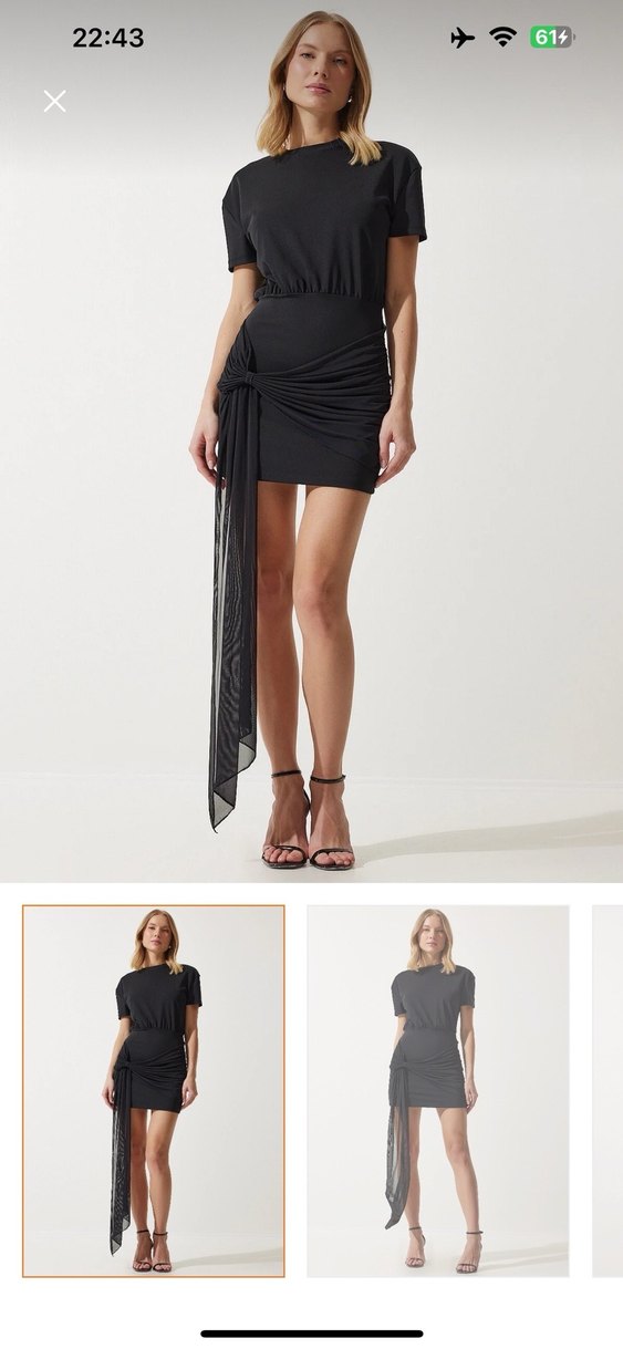 Siyah mini elbise, drapeli detaylar ve straplez yaka ile dar kesim, sentetik kumaştan üretilmiştir. Romantik akşamlar için uygundur.