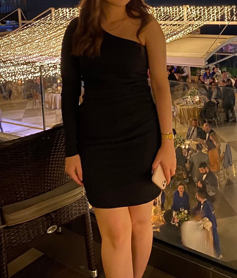 Tek kollu askılı tasarıma sahip, drapeli siyah mini elbise. Özel günlerde tercihiniz olabilir.