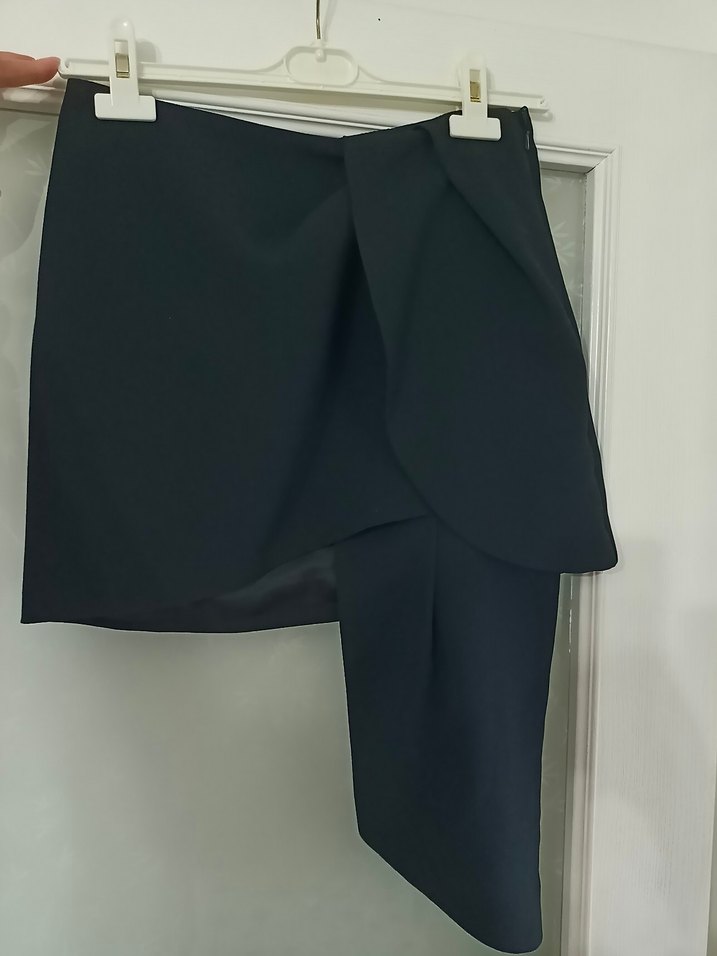 Drapeli ve fitted kesime sahip siyah mini etek, yumuşak sentetik kumaştan üretilmiştir.