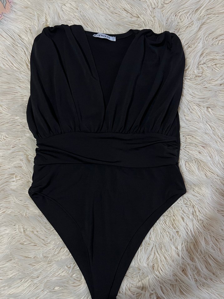 Drapeli tasarıma sahip, mini uzunlukta, vücuda oturan siyah kolsuz kadın bluz.